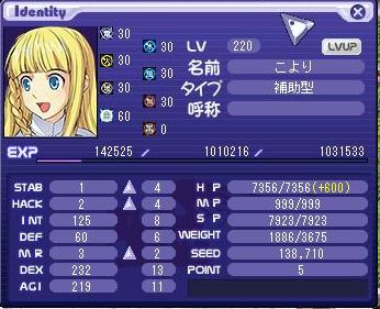 LV:215 STAB 1 HACK 2 INT 125 DEF 52 MR 30 DEX 225 AGI 210